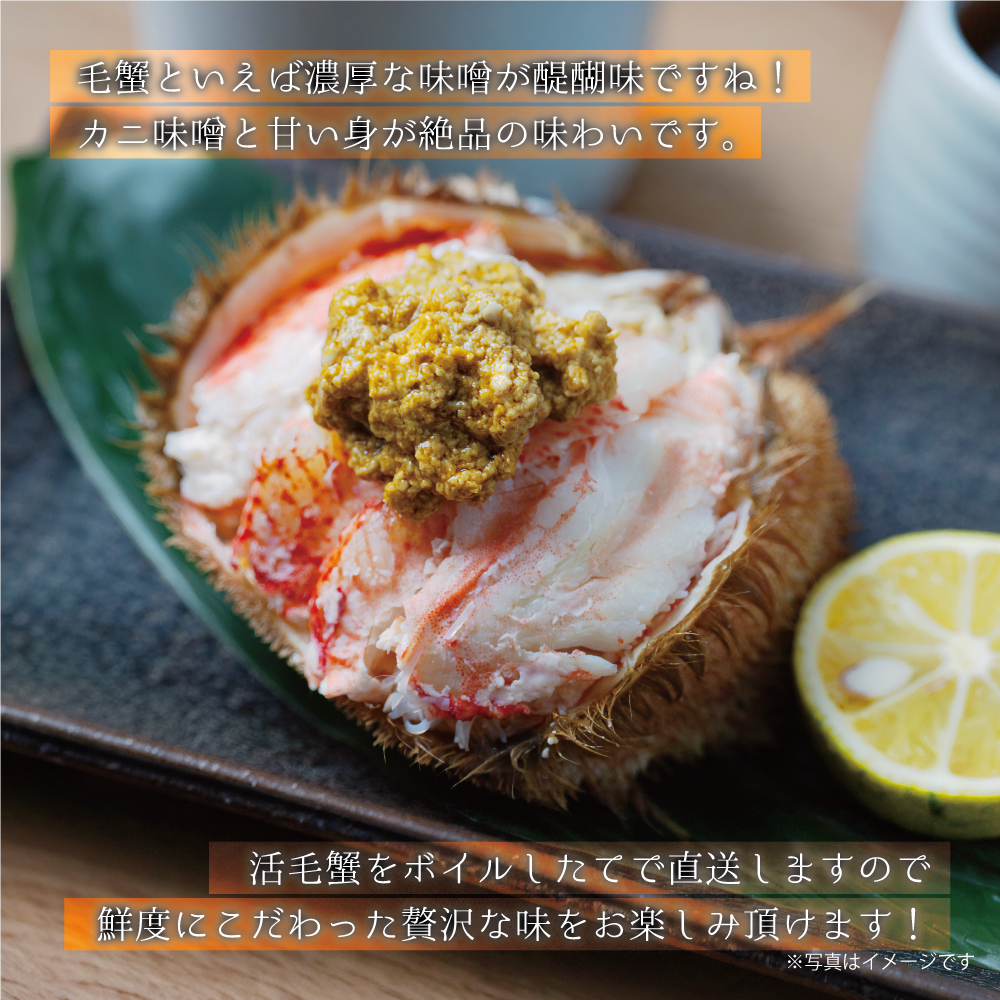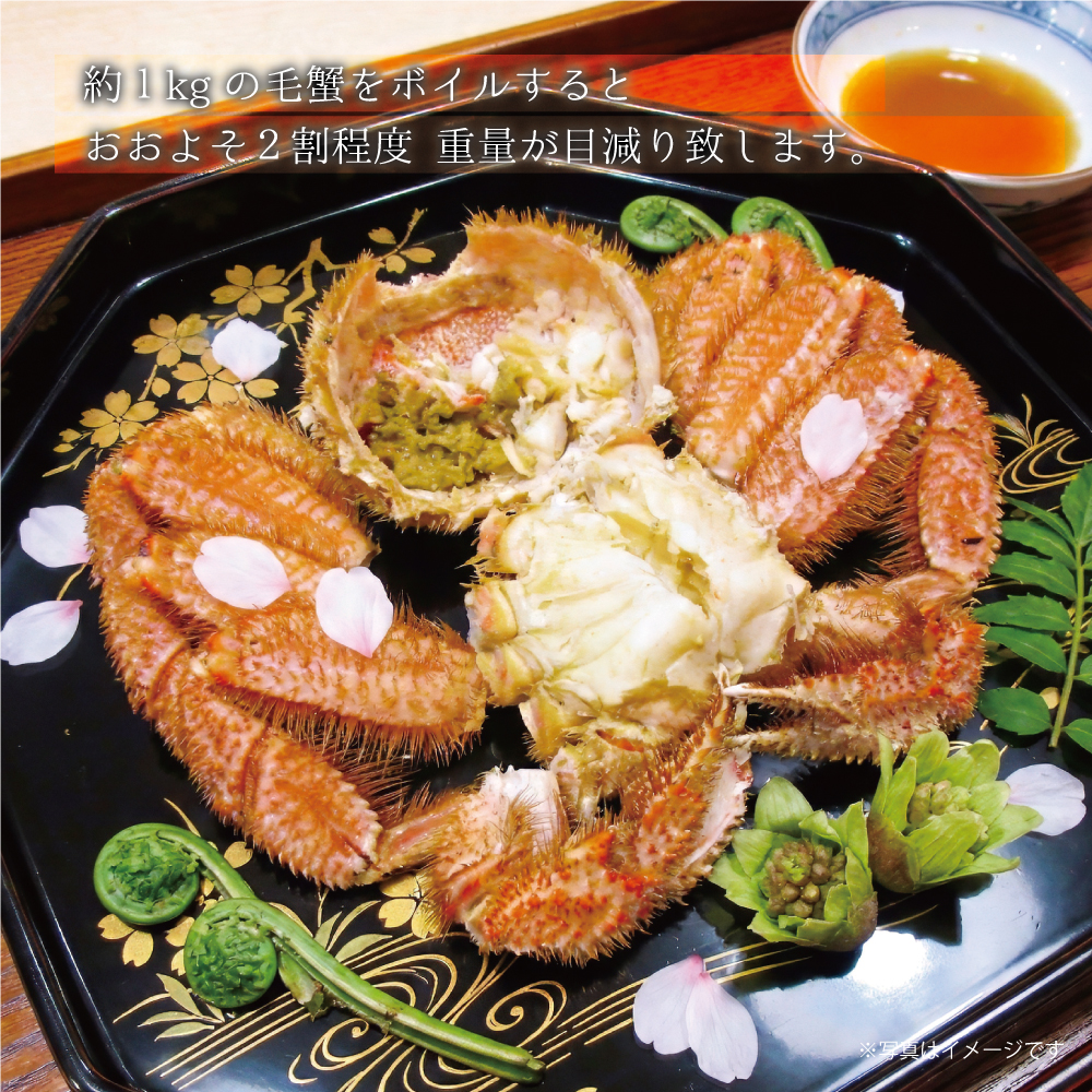 函館直送チルド便!! 活茹で毛蟹 姿1尾 約1kg【全国送料無料】<冷蔵> 店内の大型水槽から選別 北海道から直送 鮮度抜群 冷蔵 毛ガニ22,000円 (税込)活毛蟹を丸ごと釜茹で!! 新鮮な状態をぎゅっと閉じ込めました! ※活茹での際 元々の総重量からおよそ2割目減りいたします。あらかじめご了承ください。