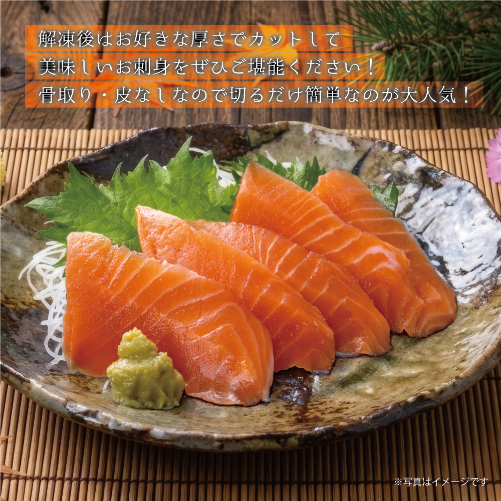 解凍後 好きな厚さにザクザク切るだけで サーモン刺身の盛り皿が完成します。