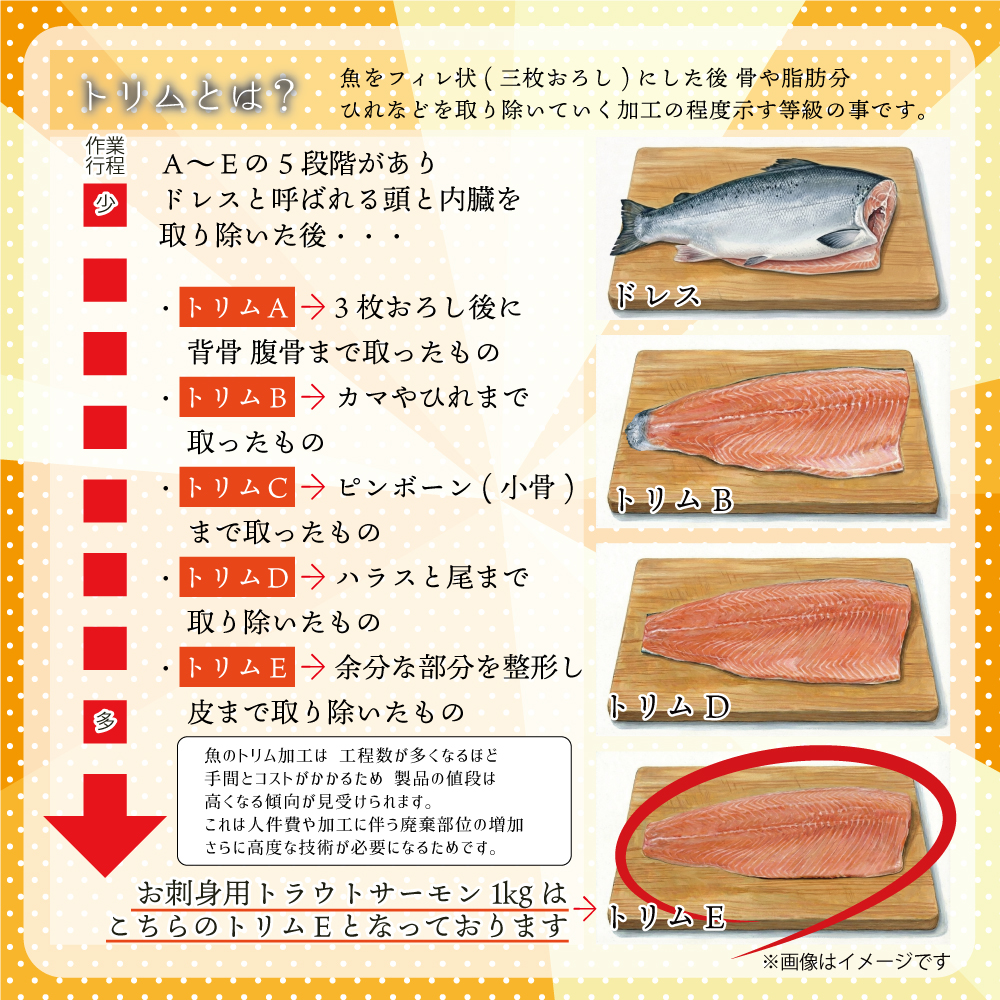 それが「お刺身用トラウトサーモン 1kg(トリムE)」 です。