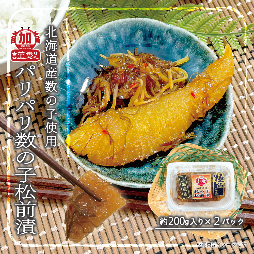原材料名:数の子(北海道産)、カラフトシシャモ卵(アイスランド)、しょうゆ(小麦・大豆を含む)、砂糖、いか加工品、醸造調味料(ぶどう糖、米醸造液、アルコール、発酵調味料、食塩)、昆布、還元水あめ、食塩、リンゴ酢、たん白加水分解物、酵母エキス、赤唐辛子、かつお節粉末、かつおエキス/ソルビット、調味料(アミノ酸等)、酒精、増粘多糖類